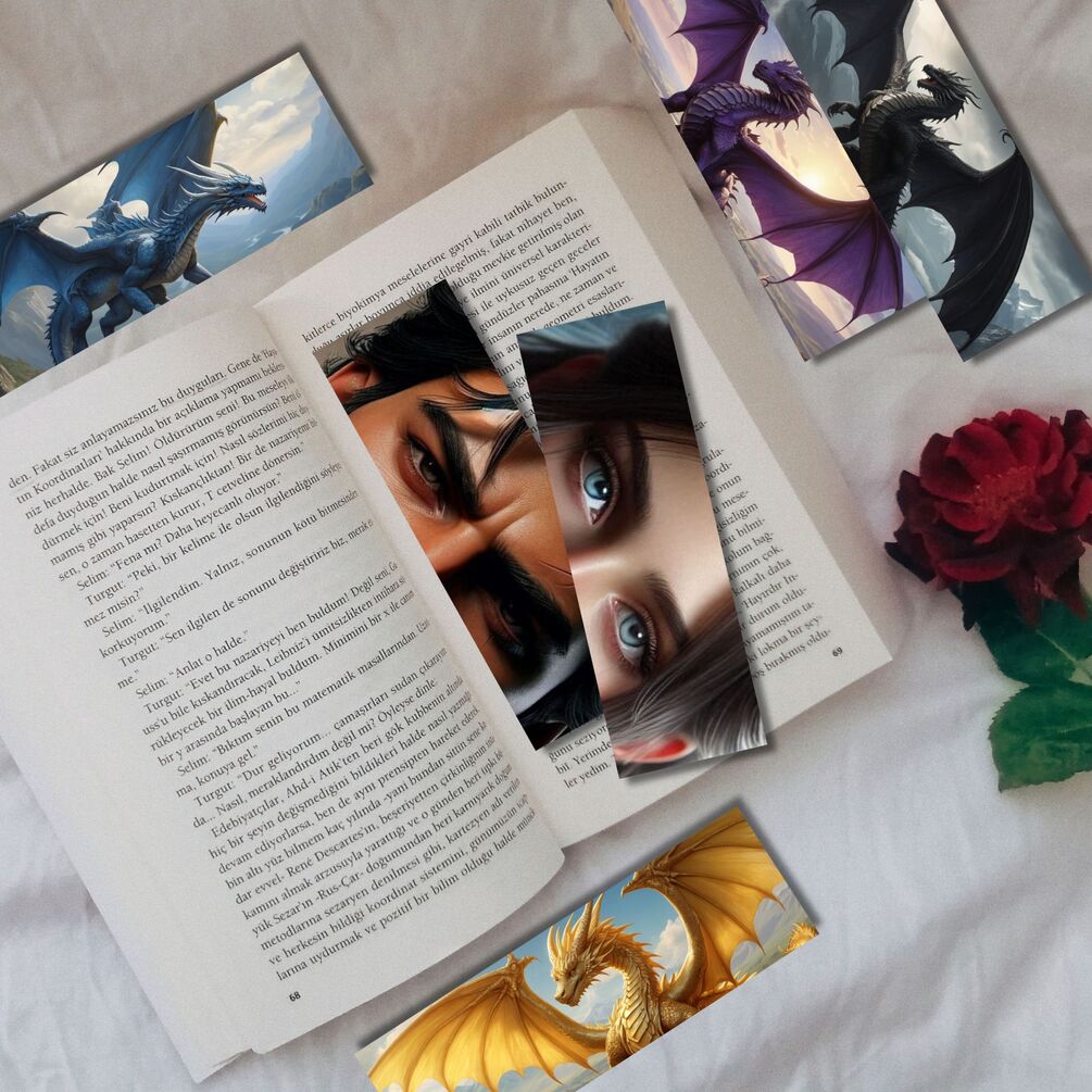 Each bookmark features detailed eye illustrations representing key characters and dragons from the series: