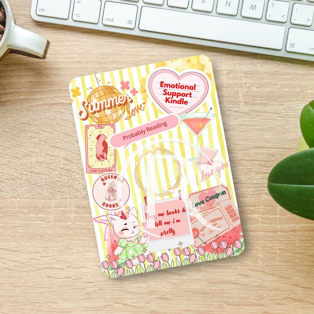 ☀️🌸 Add a splash of sunshine to your Kindle with this Summer-Inspired Insert, designed to reflect the feeling of warm days, iced drinks, and romantic reads under the sun. With soft pastel hues in yellow, pink, red, and green, this printable insert is perfect for transparent Kindle cases and book lovers who adore an aesthetic summer vibe.